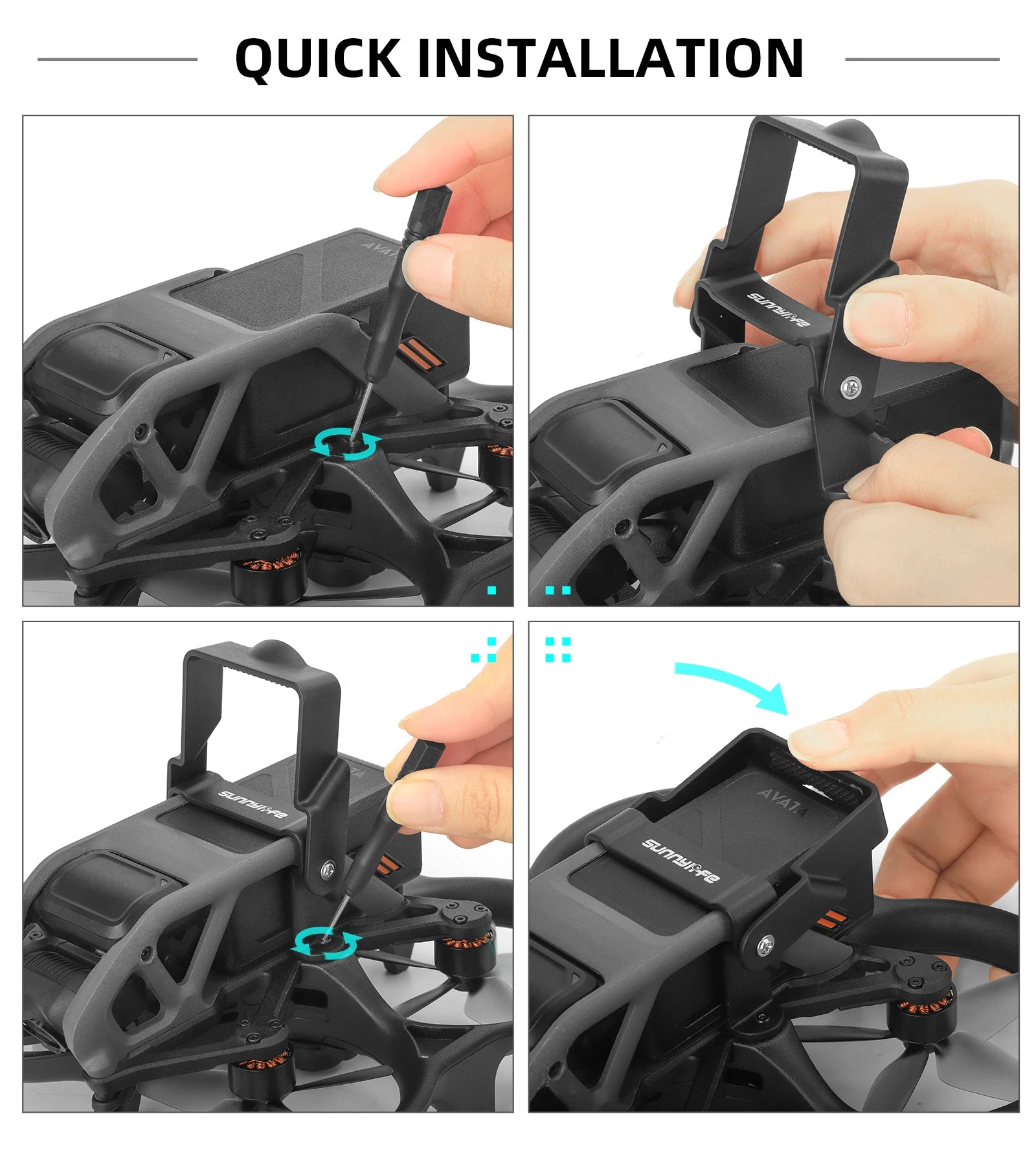 DJI AVATA FOLDABLE ANTI-RELEASE BUCKLE FREELY DISASSEMBLE AND ASSEMBLED BATTERY OIMRUUNS SPECIFICATIONS Name Applicable Models Sunnylife Foldable Anti-release Buckle Avata Model Material Net Weight Gross Weight Packing Size AT-DC503 Plastic 11g 20g 88*64*18mm FIX BAT TERY TO DRONE Not afraid of battery falling off during flying and