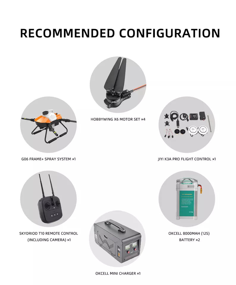 RECOMMENDED CONFIGURATION HOBBYWING X6 MOTOR SET x4 Acbd GO6 FRAME+ SPRAY SYSTEM x1 JIYI K3A PRO FLIGHT CONTROL *1 SKYDRIOD TIO REMOTE CONTROLS OKCELL 80OOMAH (125) (INCLUDING CAMERA) x2 BATTER