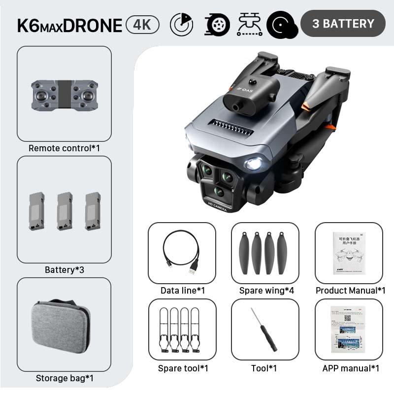 The K6 Max Drone features multiple advanced flight performances, a sleek and modern design, and an easy-to-use interface. Equipped with a three-camera system, this drone excels in its debut. It also boasts 380-degree gravity-sensing trajectory flight capabilities, allowing for smooth 360-degree rolls, all controllable through the intuitive app.