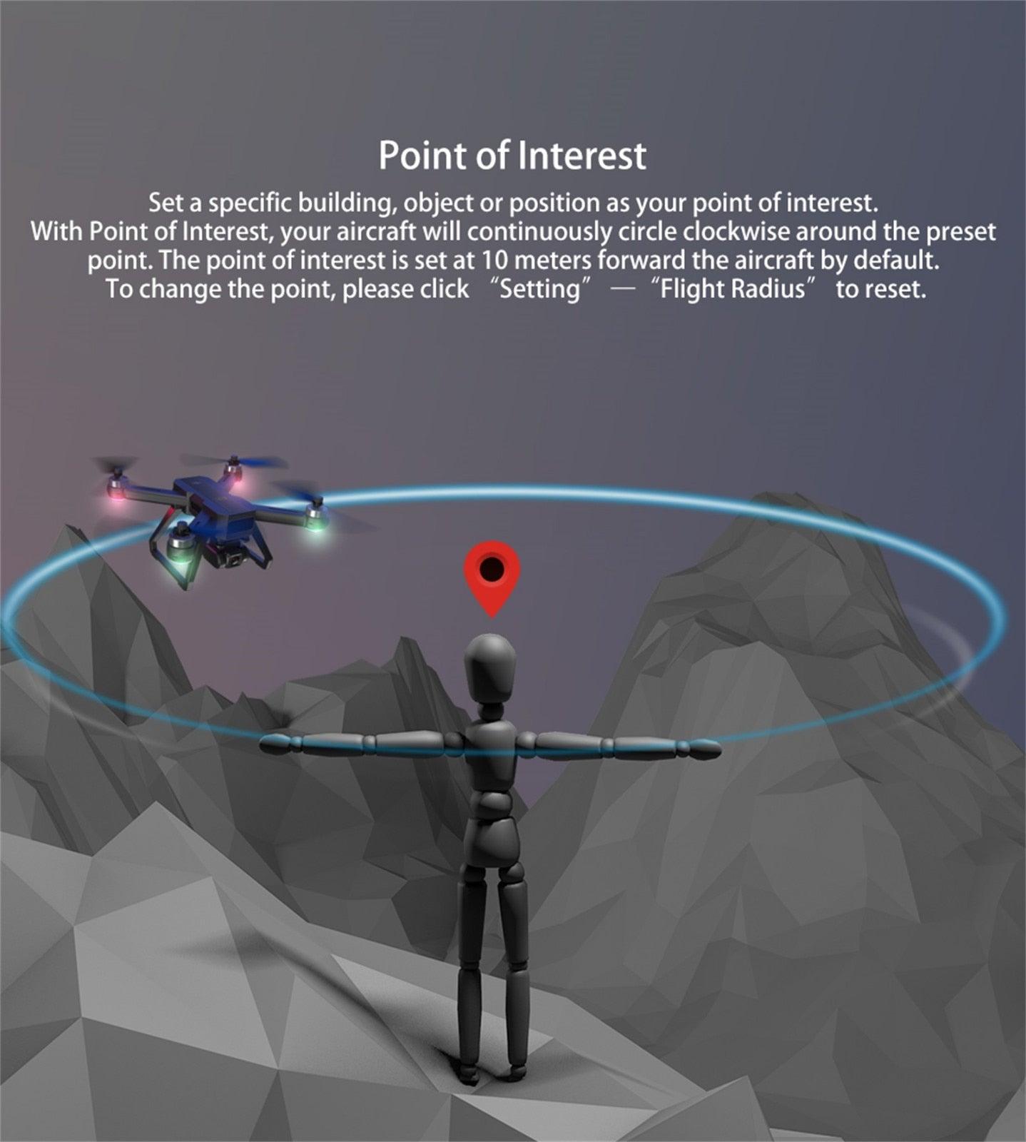 point of interest is set at 10 meters forward the aircraft by default . to change the point, please click “Setting’ “Flight Radius to reset: point: point”