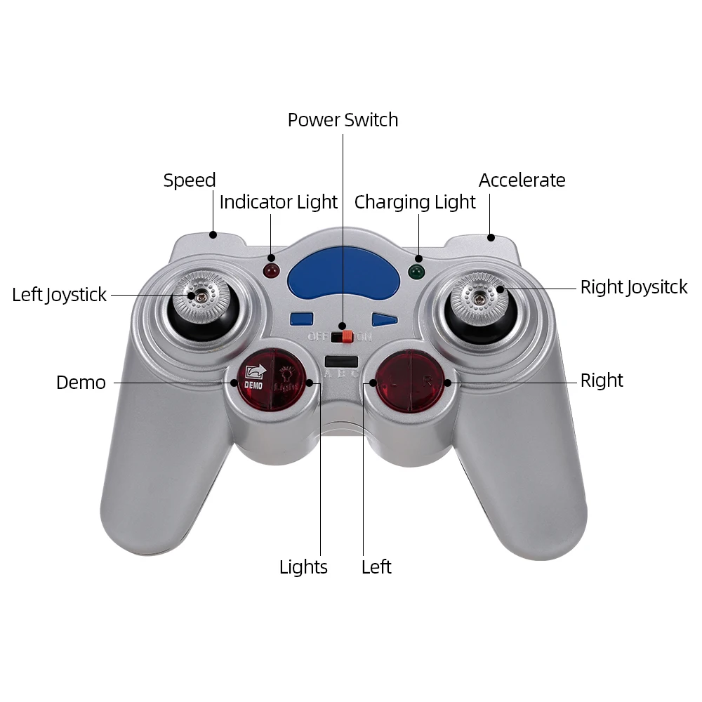 Functions: turn left/right, up/down, forward/backward, speed, demo, bright navigation light.