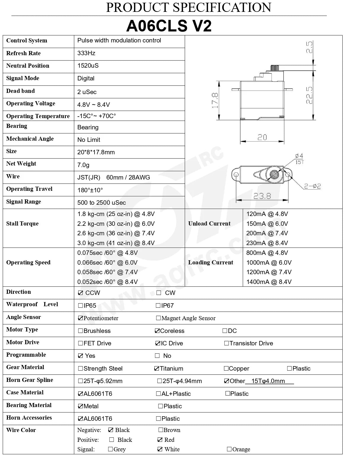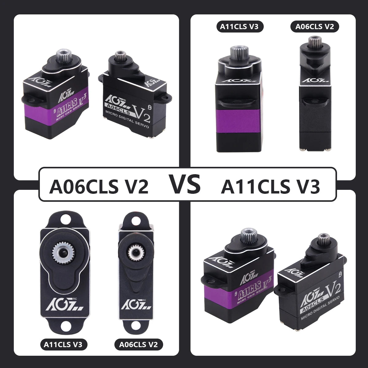 AGFrc A06CLS V2 Black is the new version of the A06CLS servo, it is designed for mini z cars and other mini scale models. This servo not only did the body to ultra-small size, but the torque go up to 3.0kg-cm and the speed can reach 0.055sec at 8.4V. With the reliable coreless motor and titanium gear, the performance is commendable. It inherits the advantages of A06CLS servo and upgraded to the 2S high voltage version, suitable for more applications now. Black and purple for selection.