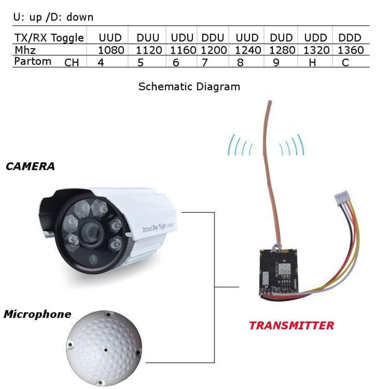 Schematic diagram for 1080-1360 MHz AV analogue signal transmission system, including camera, microphone, and transmitter unit.