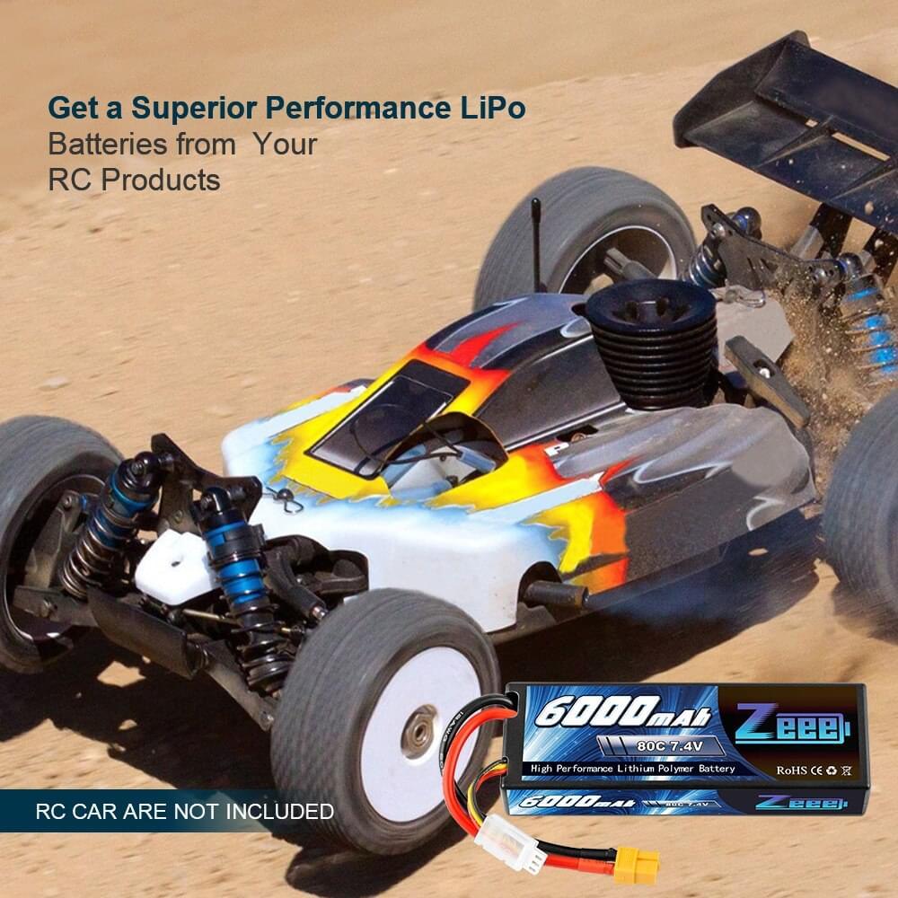 Zeee 7.4V 80C 6000mAh 2s Lipo battery specially designed for 1/8 and 1/10 RC car model such as Losi, HPI Strada XB 1/10 RTR Electric Buggy, Team Associated, ElectrixRC, Emaxx, Bandit, Rustler version, etc. – It also could be used for RC airplane, RC helicopter, RC boat, drone, FPV. – For RC battery, only if the voltage, dimension and plug match, then it will fit.