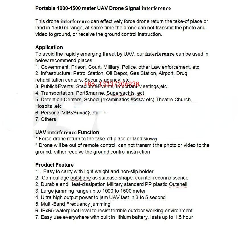 Portable 1000-1500 meter UAV Drone Signal interference This drone interference can effectively force drone retum the take-of place or land in 1500 m range, at same time the drone can not transmit the photo and video to ground; or receive the ground control instruction. Application To avoid the rapidly emerging threat by UAV, our interference can be used in below recommend places: 1. Govemment: Prison; Court, Military, Police; other Law enforcement; etc 2. Infrastructure: Petrol Station, Oil Depot, Gas Station, Airport; Drug rehabilitation centers 3. Public&Events: SiadiaruEvenenfypfanfMeetings = etc Transportation: Portemarine, Superyachts; ect 5 . Detention Centers, School examinatian lihrarv etc), Theatre,Church; Hospital,etc Personal VIParilvacy,etc 7. Others UAV interference Function Force drone return to the take-off place or land Drone will be out of remote control, can not transmit the photo or video to the ground, either receive the ground control instruction Product Feature Easy to carry with light weight and non-slip holder Camouflage outshape as suitcase shape, counter reconnaissance 2. Durable and Heat-dissipation standard PP plastic Qutshell Large range up to 1000 to 1500 meter Ultra high output power to jam UAV fast in 3 to 5 second 5. Multi-Band Frequency 6. IPx65-waterproof level to resist terrible outdoor working environment Easy use everywhere with built in Iithium battery; lasts up to 1.5 hour siowIy Military