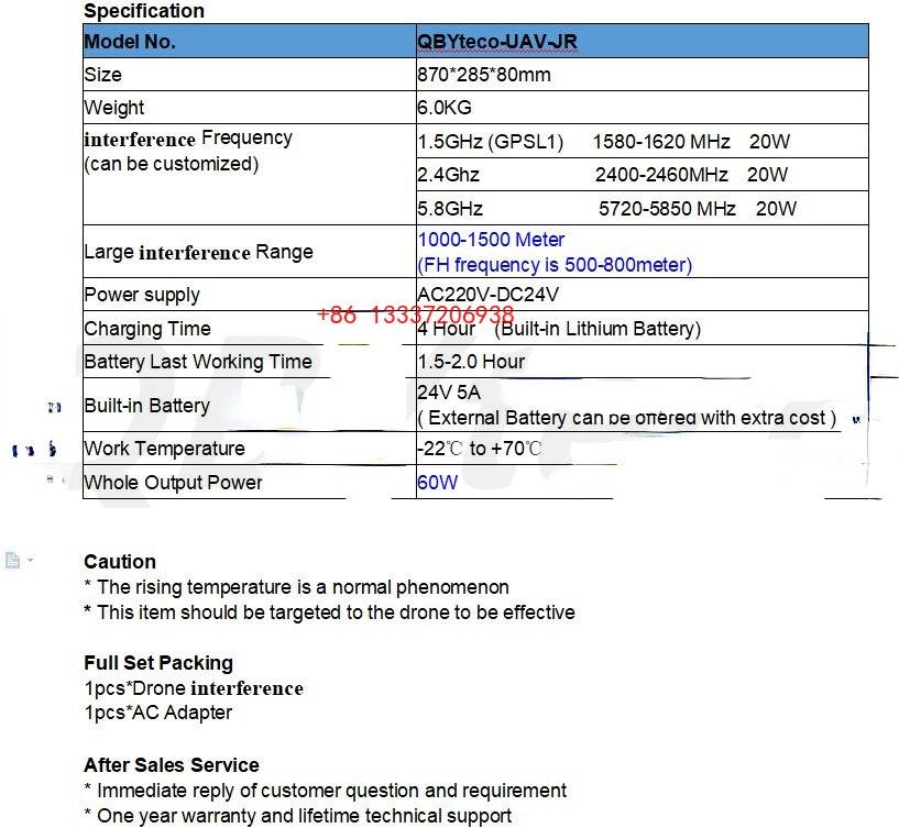 | Caution * The rising temperature is a normal phenomenon * This item should be targeted to the drone to be effective Full Set Packing 1pcs*Drone interference 1pcs*AC Adapter AfterSales Service * Immediate reply of customer question and requirement * One year warranty and lifetime technical support | |