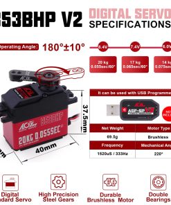 AGFRC B53BHP V2 is upgraded to the new version, its internal structure has been completely upgraded from the motor to the gears. The new version is steel gears which is made of strong steel material, and the PIN shaft is reinforced to 2.0mm, stronger and more reliable than before. It can reach 20KG high torque and 0.055Sec fast speed. The appearance adopts the CNC aluminium middle case design, new laser engraving logo, and support the programmable parameter function. This upgrade makes servo more powerful and efficient, and can fit more needs.