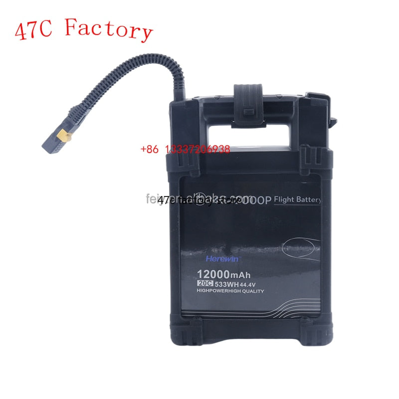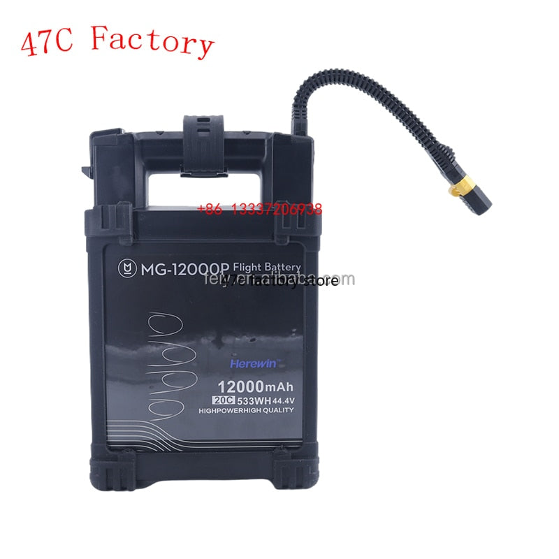 The MG-12000P Flight Battery has a capacity of 12000 mAh at a voltage of 44.4 V. The battery features a charging and discharging monitoring function, and its advanced power management system and high energy battery cells mean it can provide the power that your aircraft requires.