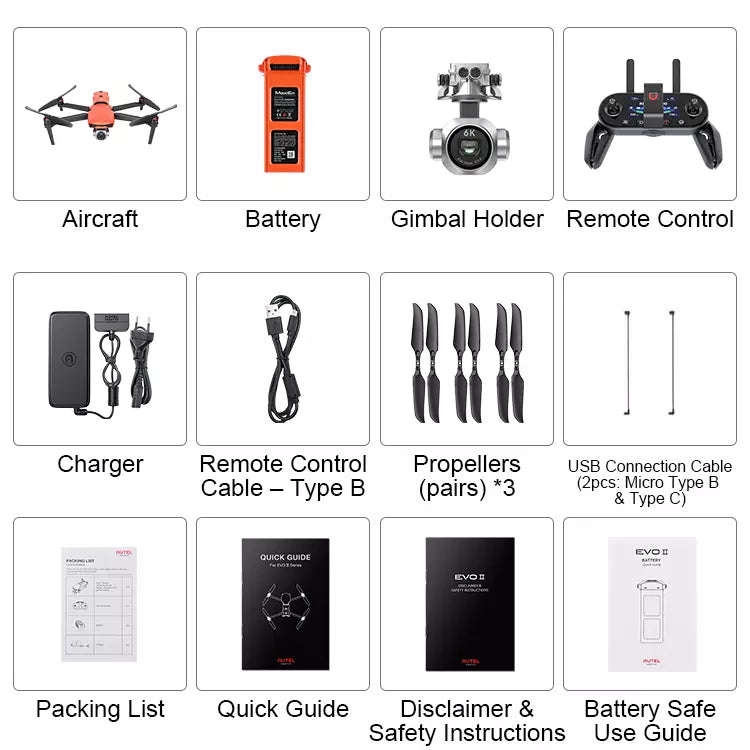 - 25 kmEVO II Pro CameraSensor1″ CMOSFOV82°effective pixels20MPPhoto resolution5472*3648 (3:2),5472*3076 (16:9),3840*2160 (16:9)ISO RangeVideo: 100-6400 (auto),Photos: 100-12800Zoom1-16x (up to 3x lossless zoom)Still Photography Resolution5472*3648 (3:2),5472*3076 (16:9),3840*2160 (16:9)Video FormatMP4 / MOV (MPEG-4 AVC/H.264, HEVC/H.265)Max Bitrate120Mbps