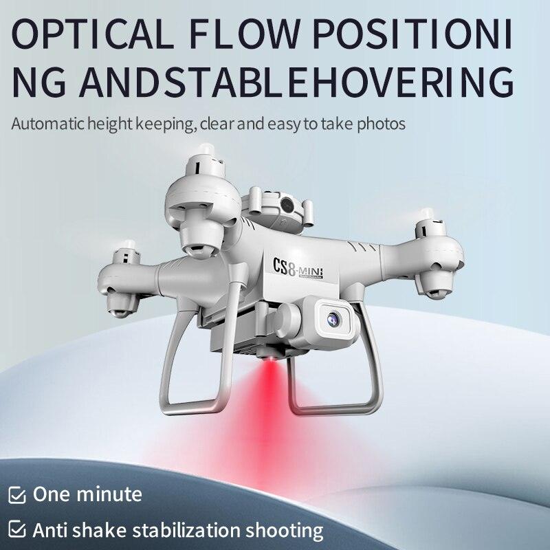 PRODUCT PARAMETERS Product Name CS8-MiNi size 15.8CM*7.5CM*20.5CM Flight system Optical positioning hover Camera parameters 4K HD pixels Bottom 1080p pixels Remote controlba Battery 7 Battery parameters 3.7V modular lithium battery600 Ma Endurance time About 12 minutes Flight distance About 200 meters Charging time About 45 minutes Remote control signal 5GHz high frequency Aircraft weight flow ittery 58
