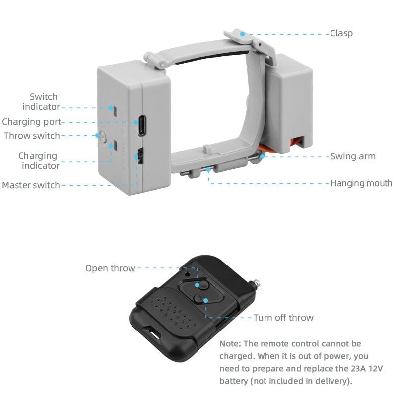 1. Suitable for Mini 3 Pro drone, can be delivered remotely, used for throwing bait, throwing gifts, giving wedding rings, etc.
