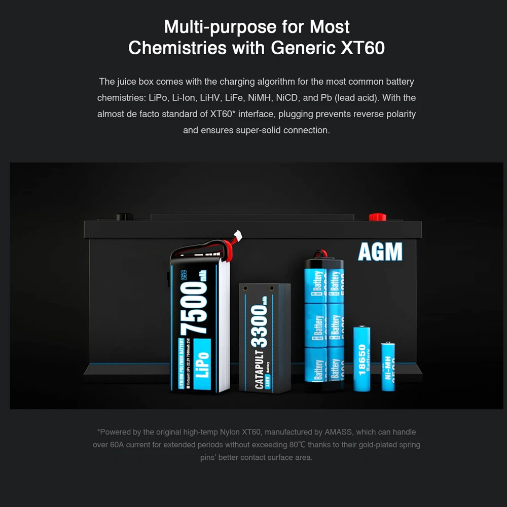 The juice box comes with the charging algorithm for the most common battery chemistries: LiPo, Li-Ion, LiHV, LiFe, NiMH, NiCD, and Pb(lead acid). With the almost de facto standard of XT60 interface, plugging prevents reverse polarity and ensures super-solid connection.