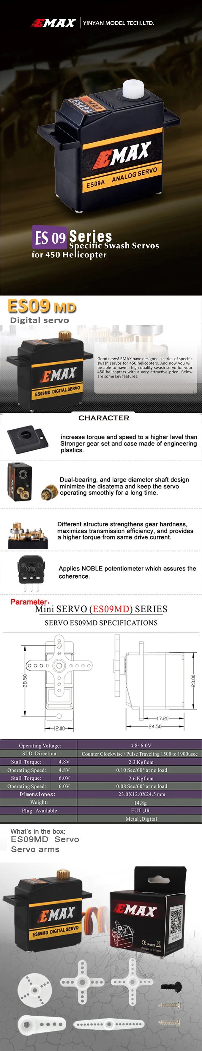 EMAX has designed a series of specific swash servos for 450 helicopters, allowing you to enjoy high-quality performance at an attractive price. The dual-bearing and large diameter shaft design also minimize downtime and reduce the risk of disassembly.