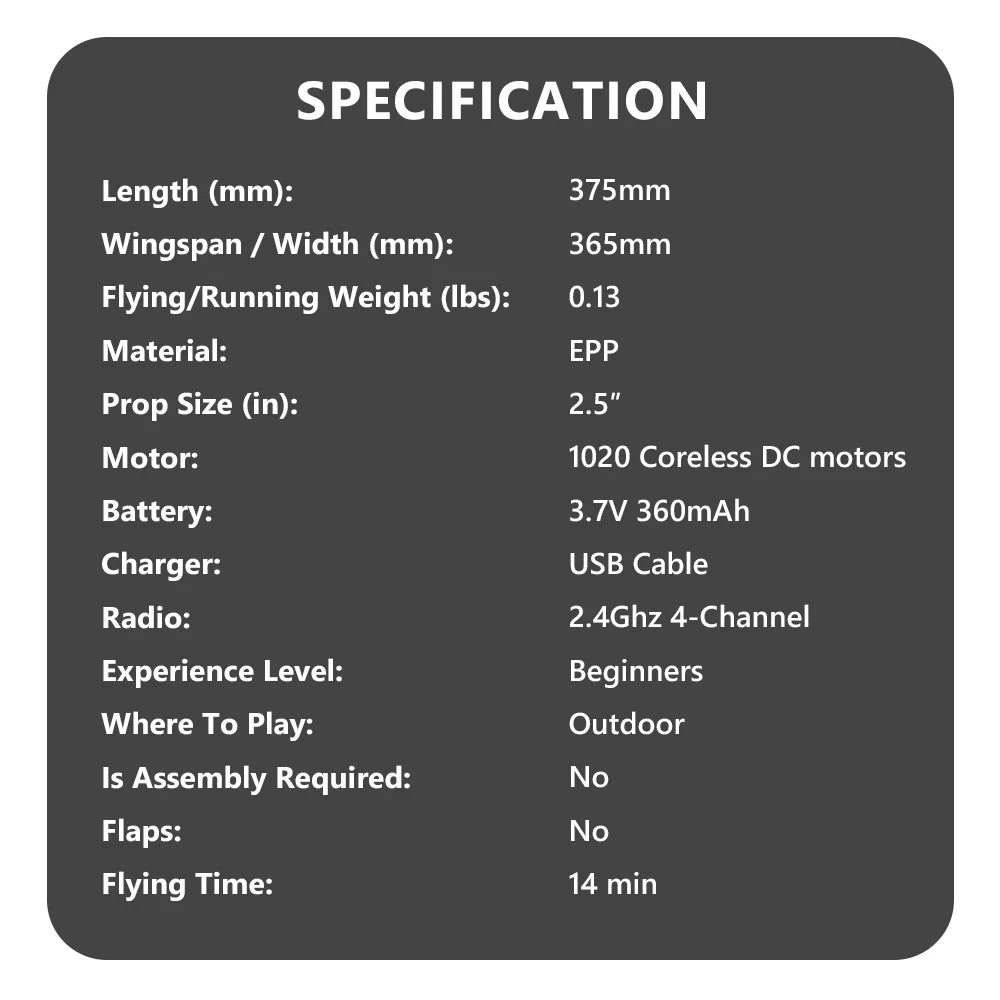 • Flying/running weight: approximately 0.13 Ibs (59g)