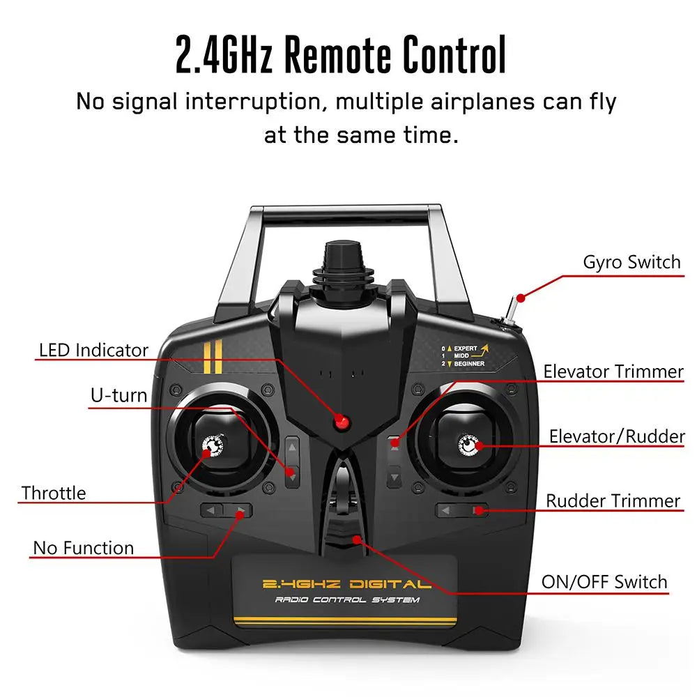 The 2.4GHz remote control ensures seamless operation with no signal interruptions, allowing multiple aircraft to fly simultaneously. Additionally, it features an easy-to-use ON/OFF switch for the radio control system.