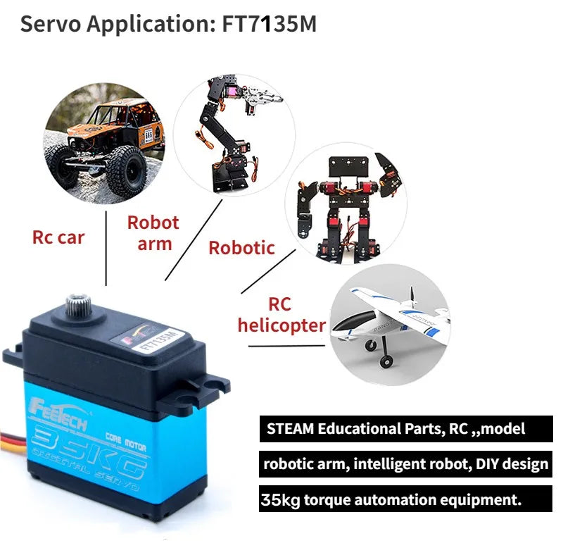 ![]() ![]() ![]() ![]() ![]() Feetech FT7135M Digital Servo is designed for RC cars, robots, and helicopters. It features a metal gear and waterproof design, making it suitable for use in various applications such as robotics, STEAM education, and DIY projects. The servo has a high torque output of 35kg and can rotate up to 180 degrees. ![]() ![]() The Feetech FT7135M digital servo is designed for use in RC cars, robotics, and educational projects. It features a metal arm and intelligent design, with a torque output of 35kg and a rotation range of 180 degrees, making it suitable for DIY automation projects. ![]()