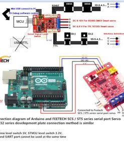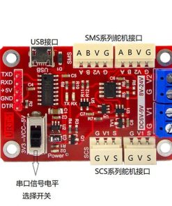 In the URT-1 board, serial signal conversion circuit respectively into two different levels of signal, which A road – asynchronous half duplex RS485 level port can be connected to the SMS series servo; B – asynchronous half duplex TTL level single bus port can be connected to the SCS series of steering gear.