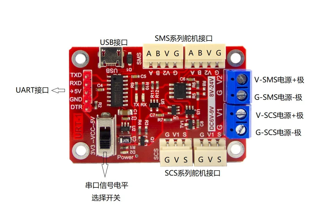 USB port using USB MINI interface; UART interface with 2.54 row spacing general; SMS series servo interface using 5264-4AW interface can be directly connected to the steering gear; SCS series servo interface using 5264-3AW interface can be directly connected to the steering gear.