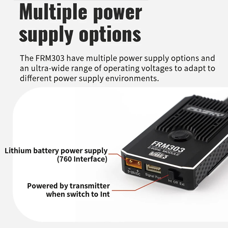 The FLYSKY FRM303 TX module offers multiple power supply options and an ultra-wide operating voltage range, allowing it to adapt to various power supply environments. Additionally, when powered by a transmitter, the FRM303 can switch seamlessly between its internal and external modules.