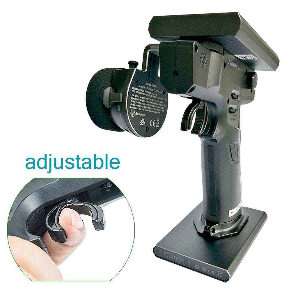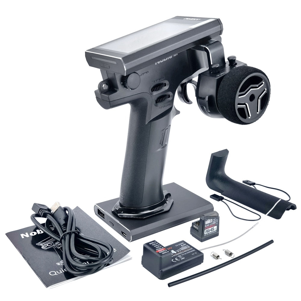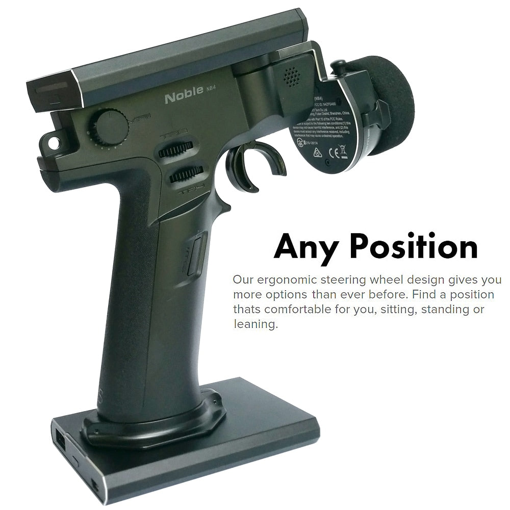 The Noble NB4 features low latency performance, with response times under 3 milliseconds, and boasts an ambidextrous design, along with a dual battery system that supports the MINI-Z EVO series.