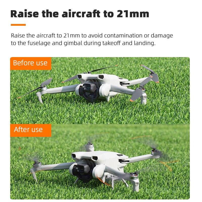 Elevate your DJI Mini 3 drone by 21mm with our foldable landing gear to prevent contamination or damage to the fuselage and gimbal during takeoff and landing. This feature ensures safe and secure deployment, whether you’re using it before or after a flight.