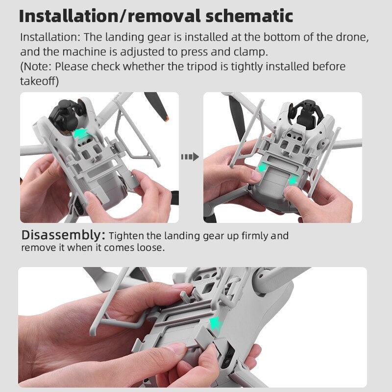 The foldable landing gear installs neatly at the base of your DJI Mini 3 drone, allowing for secure attachment and adjustment via a press-and-clamp mechanism.