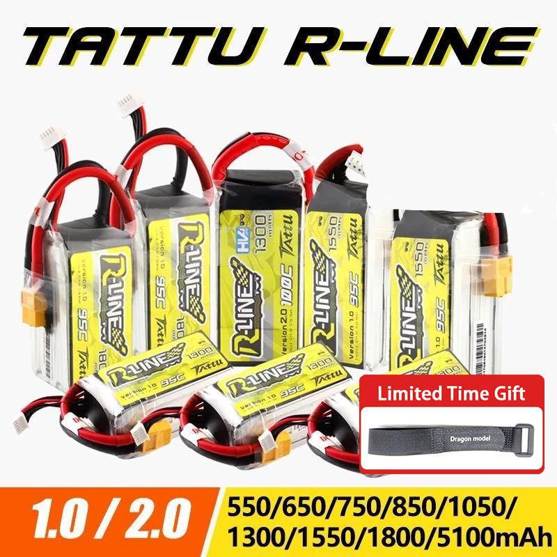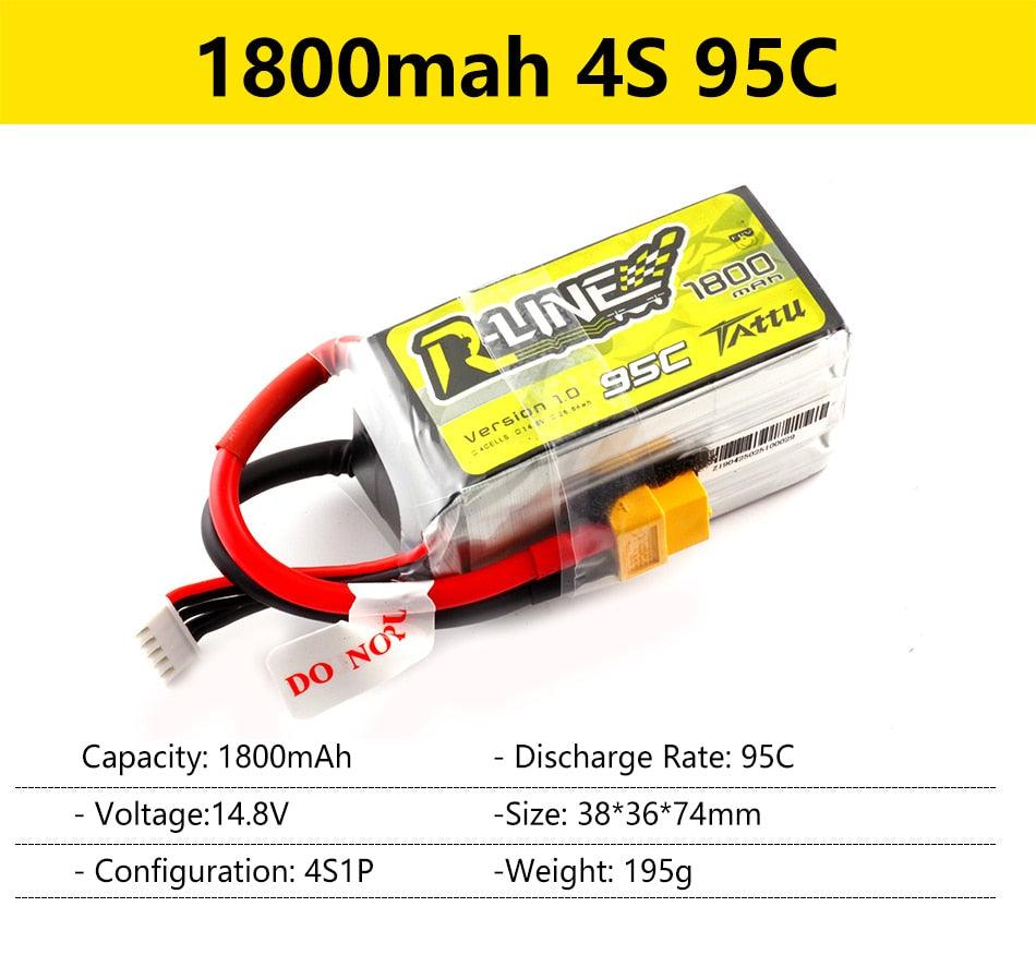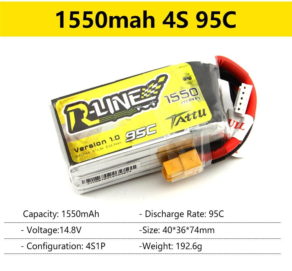 Gens Ace Tattu R-Line 1550mAh, 4S, 95C battery. Specifications include: