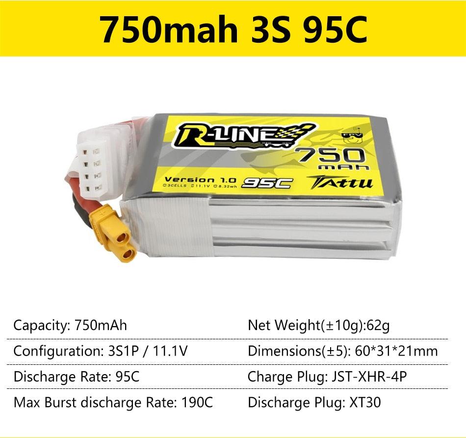 Gens Ace Tattu R-Line 750mAh, 3S, 95C battery. Specifications include: