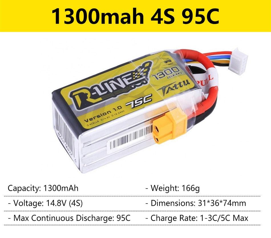 Gens Ace Tattu R-Line 1300mAh, 4S, 95C battery. Specifications include: