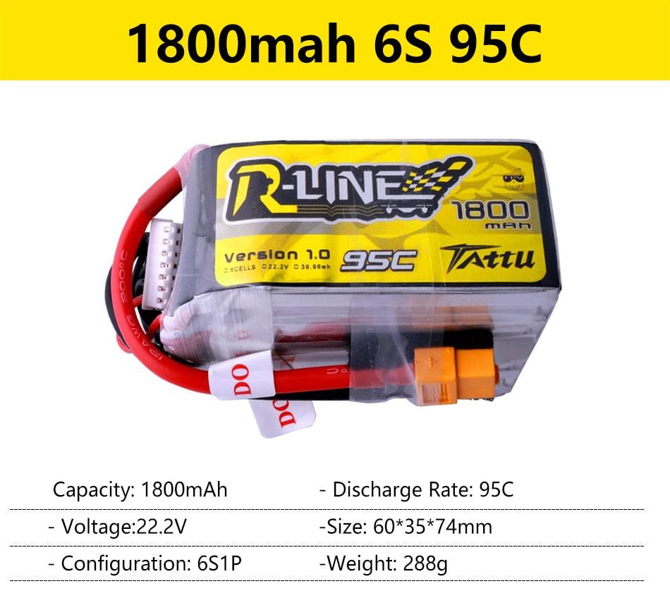 Gens Ace Tattu R-Line 1800mAh, 6S, 95C battery. Specifications include: