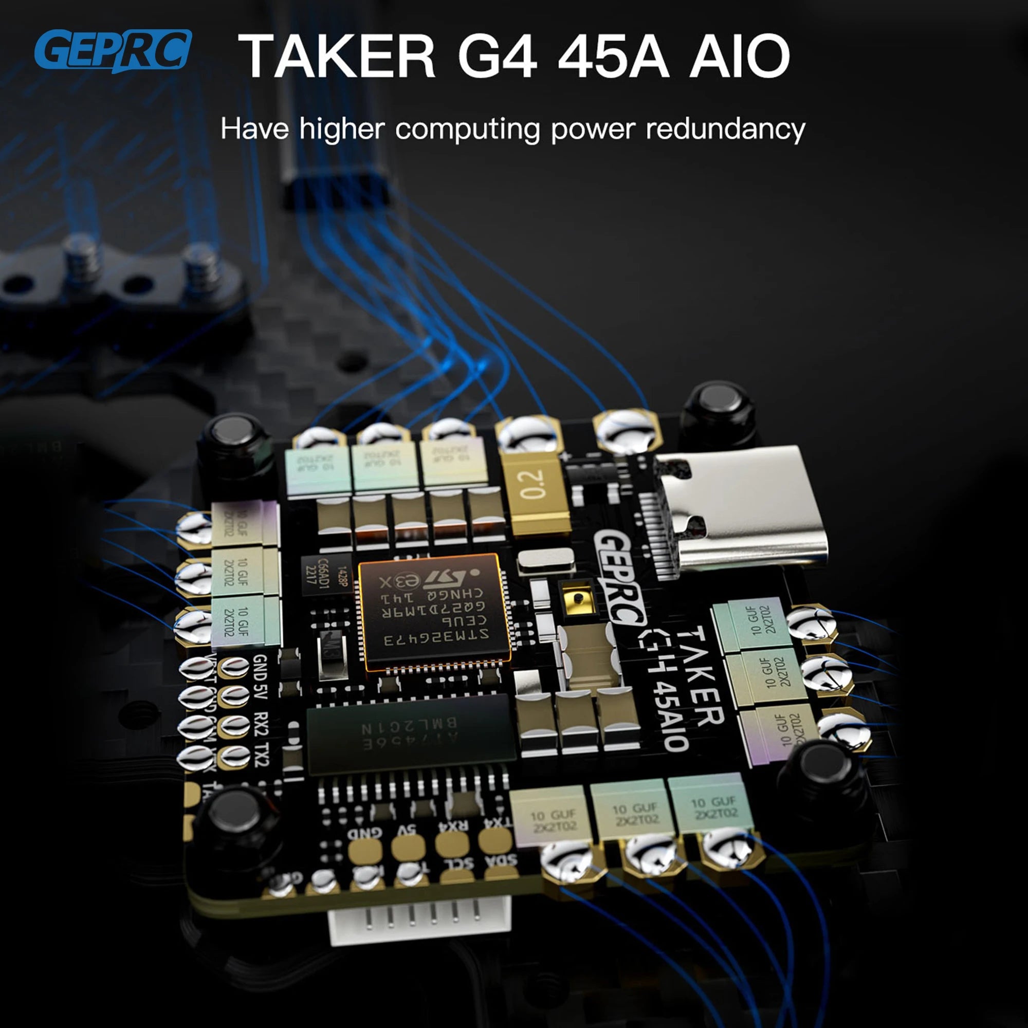 Equipped with Taker G4 45A AIO flight control, which has higher computing power redundancy. The use of a top-mounted fixed GPS can avoid the impact of its own electromagnetic interference on flight, and the rescue function is more stable.Silicone camera shock-absorbing pad prevents high-frequency jello from O3 camera.