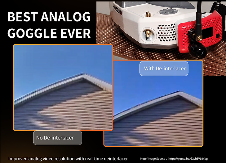 A standout feature of the HDZero goggles is the real-time de-interlacer. This innovative technology improves analog video resolution by intelligently combining interlaced fields, setting a new standard in FPV goggle technology. This is particularly beneficial for users seeking enhanced video clarity and detail.