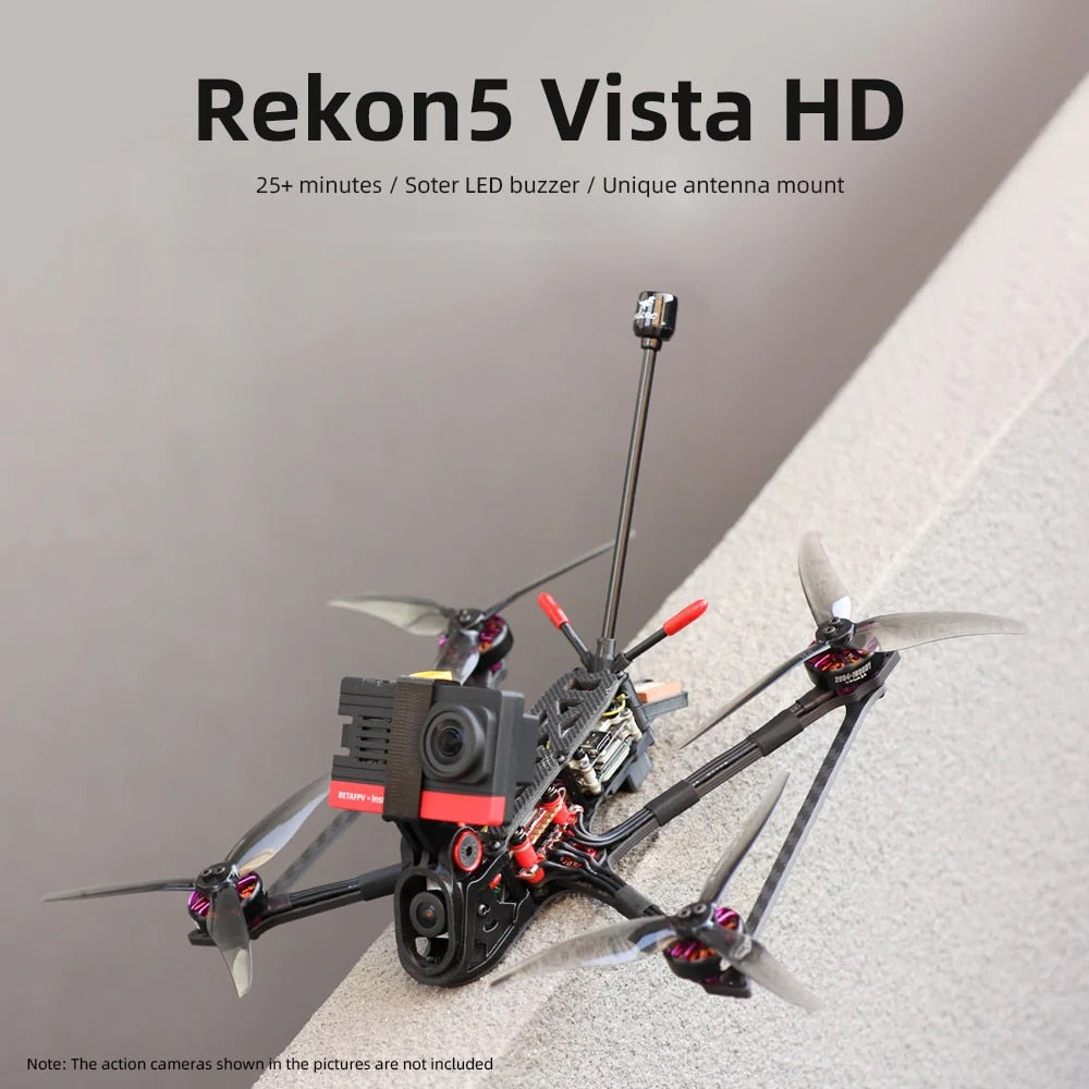 Rekon 5 Vista HD: Enjoy up to 25 minutes of flight time, featuring a built-in LED buzzer and unique antenna mount. Note that the action cameras depicted in the images are not included. This mini quadcopter is easy to carry and can be paired with GoPro or naked GoPro cameras (note: SMO mounts need to be purchased separately for 4K capabilities).