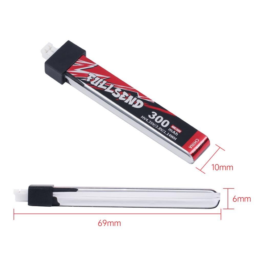 The FULLSEND 1S HV 4.35V 300mAh 30C Lipo Battery comes in a very lightweight and very compact size. The long shape of this battery makes it works best on Alpha A65 Tiny Whoop drone.