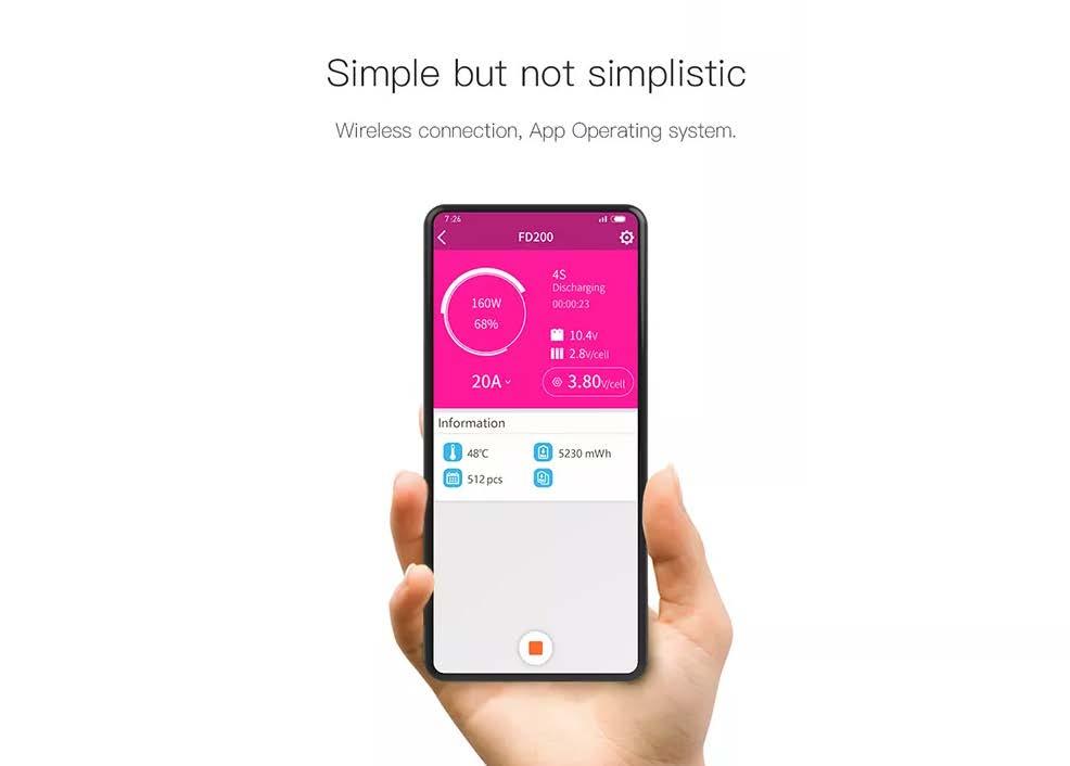 This product features wireless connectivity and app operation. The FD-200 Smart Control Discharger has a maximum discharge power of 160W, supports up to 6.6Ah (6820mAh) capacity, and comes in a pack of 512 units.