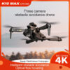 Technical Specifications: K10 MAx Drone – 4K Obstacle Avoidance Three-Camera Drone. Product Size: [Insert size measurements]. Features: 4K electric adjustment, three-camera vertical screen + lens parameters, horizontal screen, and overhead camera flight performance. Connectivity: 2.4G WiFi. Battery Life: Approximately 15 minutes.