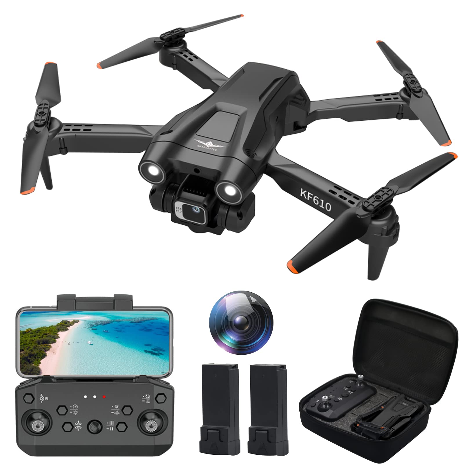 The KF610 drone features auto-detection of cameras at boot, supports remote control up to 150