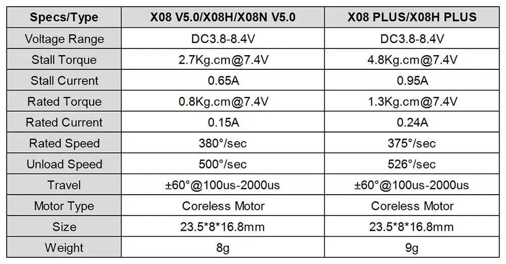 The KST X08H Plus Metal Gear servo has the following specifications: it is a digital wing coreless servo that operates within a voltage range of DC 3.8-8.4V, with a maximum torque of 4.8kg.cm at 7.4V. The stall current is 0.65A to 0.95A, while the rated torque and speed are 0.15A and 3802/second, respectively. The unload speed is 500