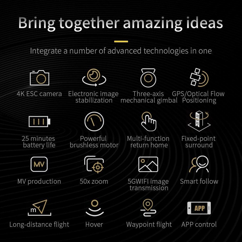 This drone features a powerful GPS system, long-lasting battery life, brushless motors for smooth flight, flow positioning, and MV production capabilities. It also offers multi-function modes, including fixed-point return home, surround views, 50x zoom, and 5G WiFi image transmission with smart follow technology for long-distance hover and waypoint flights.