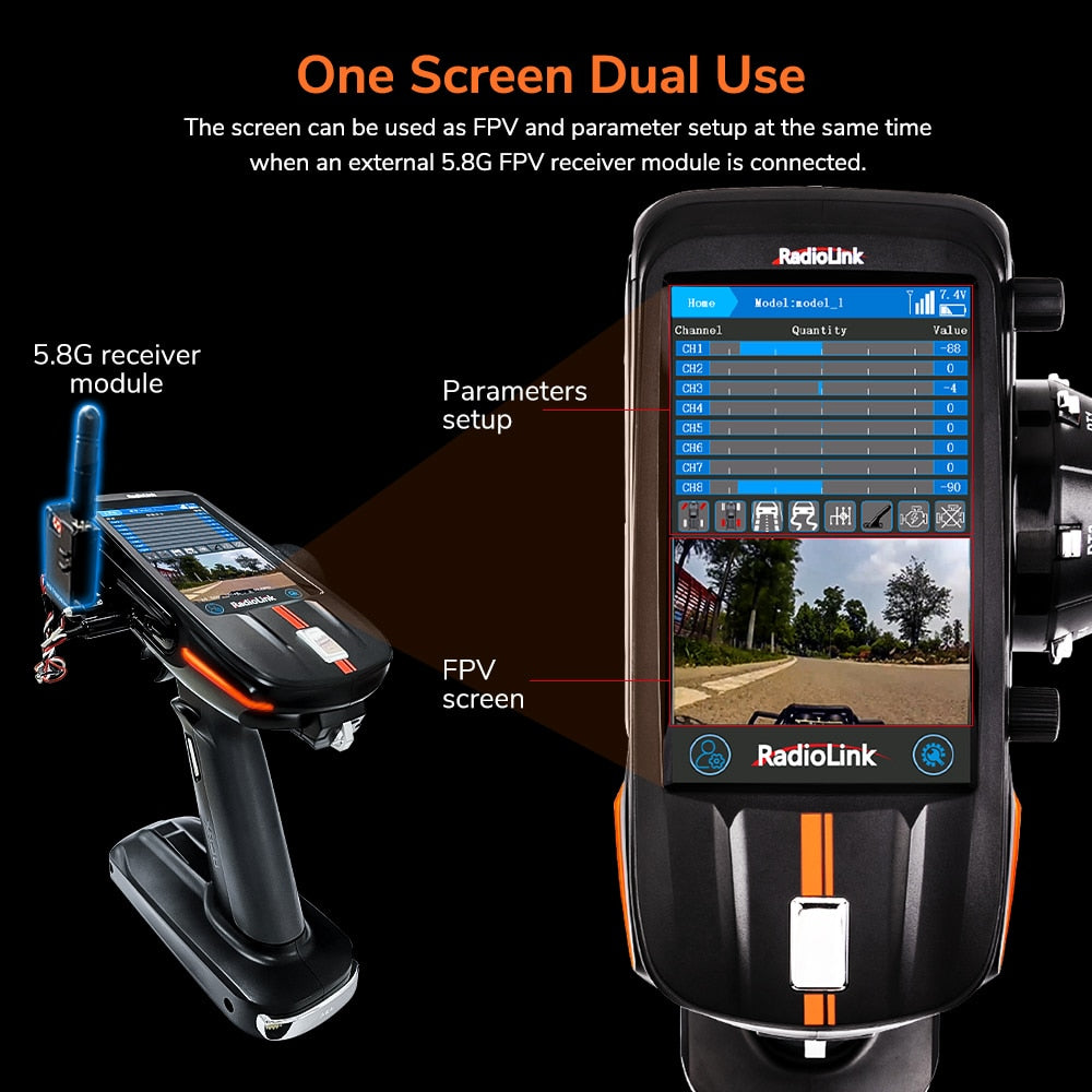 screen can be used as FPV and parameter setup at the same time . external 5.8G FPv receiver module is connected to the screen .