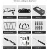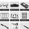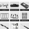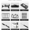 The package includes one drone aircraft, one remote control, one battery, one protective frame, two propeller blades, four USB charging cables, one instruction manual, one screwdriver, one guidebook, and one quick-start manual.