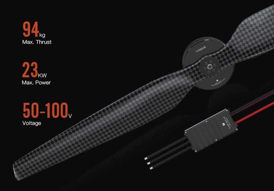 Product Details: The motor, specifically the T-MOTOR U15XL KV38, has a thrust of 100kg and a power output of 23KW. It’s designed for heavy lifting multi-rotor drones. The ESC item features a 300A rating with an included weight (including cables) of 870g, dimensions of 154.9 x 69.6 x 48.9mm, and does not have a BEC or programable items. Additionally, it does not support voltage above 14-245V, with a maximum current of 240A and peak current of 300A (1 OS). The specifications include the use of a 52x20inch propeller model, which weighs approximately 430+20g made from carbon fiber (CF) and epoxy with a glossy surface treatment. This motor is part of T-MOTOR’s Series 2blades, featuring two blades.