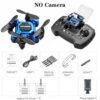 The remote-controlled mini drone requires 2 x AAA batteries for operation. The left side features a storage compartment that can accommodate either the fan blade or protective frame. When folded, this compact drone measures approximately 8cm x 6cm x 3cm and can be easily stowed away.