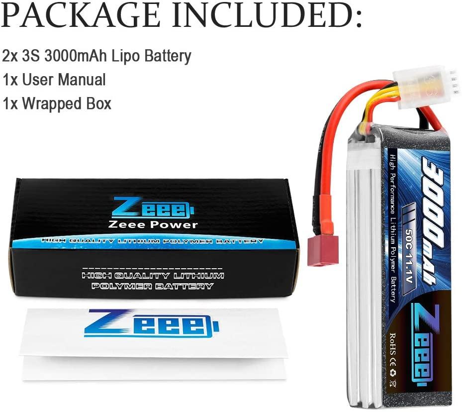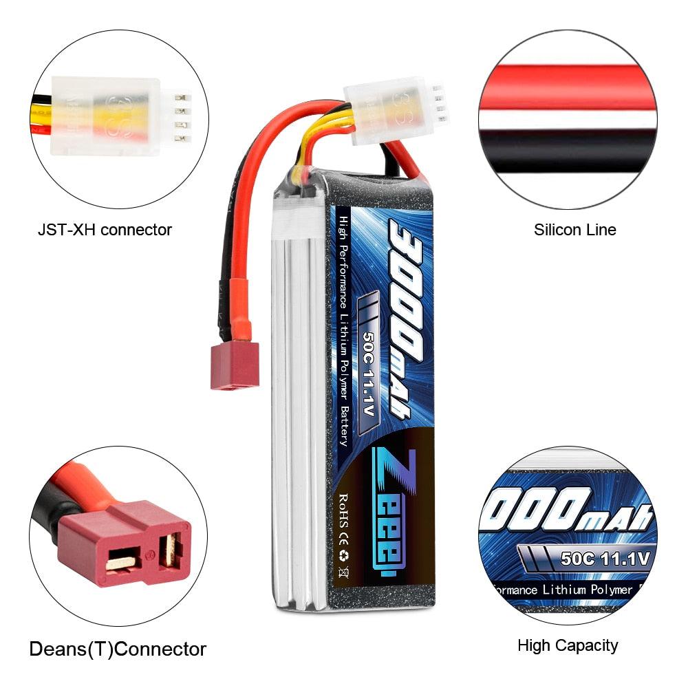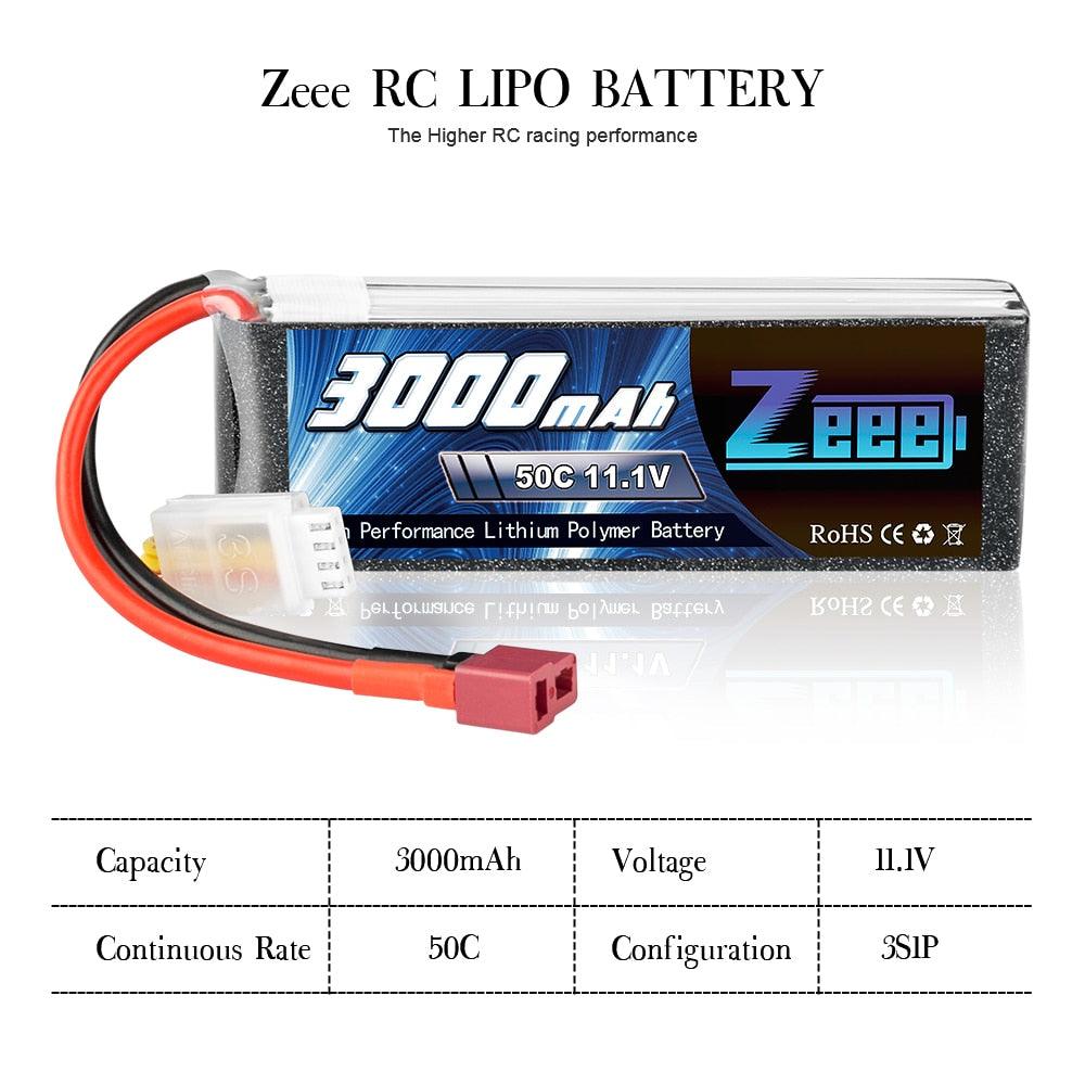 Zeee’s high-performance lithium polymer battery provides exceptional RC racing performance with a capacity of 3000mAh, 11.1V voltage, and 50C continuous discharge rate. It meets RoHS standards and features a 3S configuration.