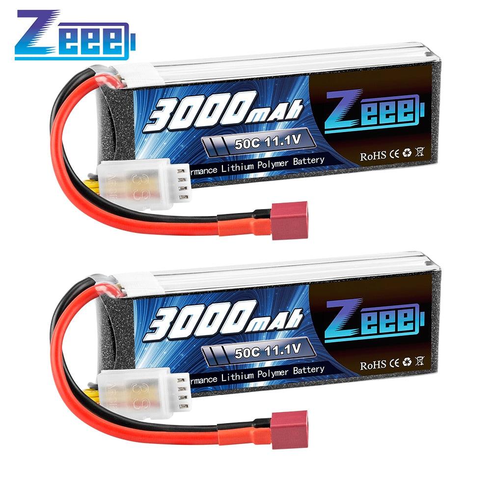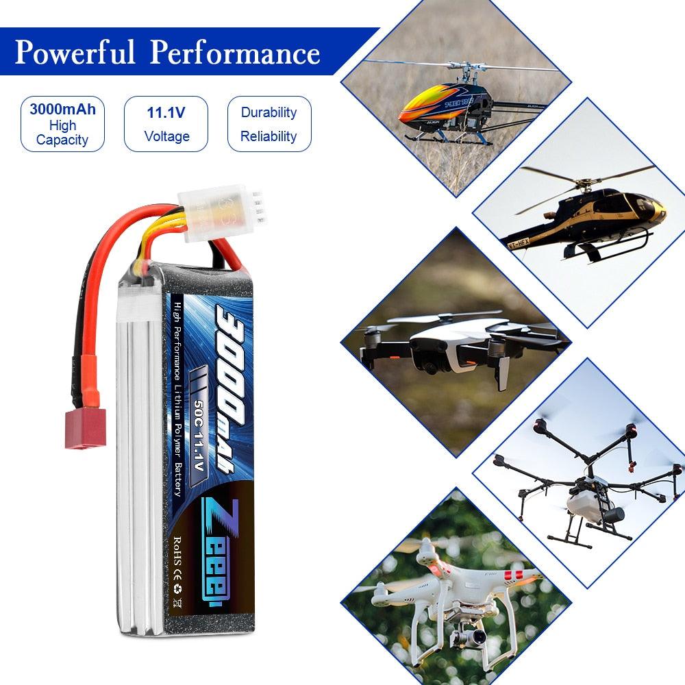 Zee Electric offers high-performance 3S lithium polymer batteries with a capacity of 3000mAh, 11.1V voltage, and 50C discharge rate. These soft-case batteries provide an impressive amount of run time and are suitable for use in RC helicopters, airplanes, cars, trucks, boats, and FPV drones.