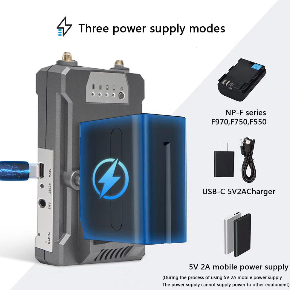 This wireless HDMI extender kit uses NP-F series batteries (F970, F750, or F500) and includes a USB-C charger with a mobile power supply output of 2A. The battery life varies depending on the transmitter (TX) or receiver (RX) usage: