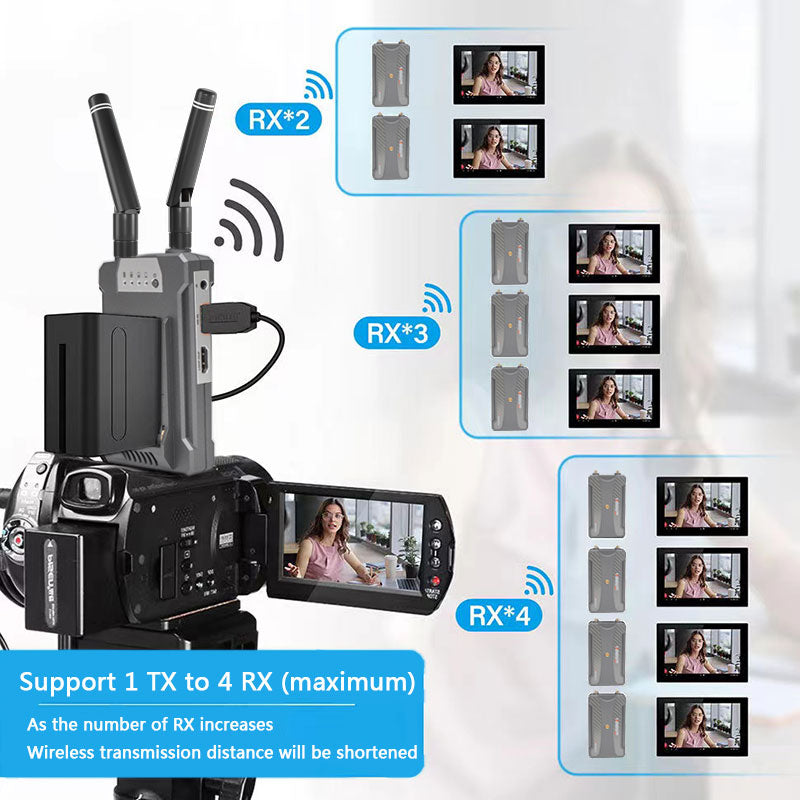 This wireless HDMI extender kit supports up to 4 receiver units (RX) connected to a single transmitter unit (TX), with a maximum transmission distance that decreases as the number of receivers increases.