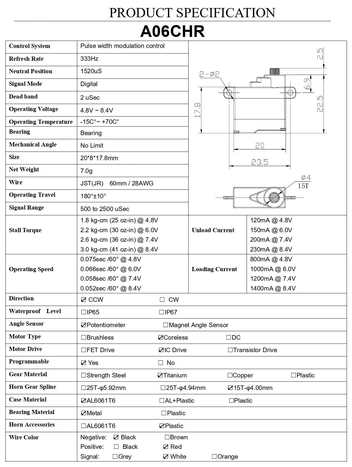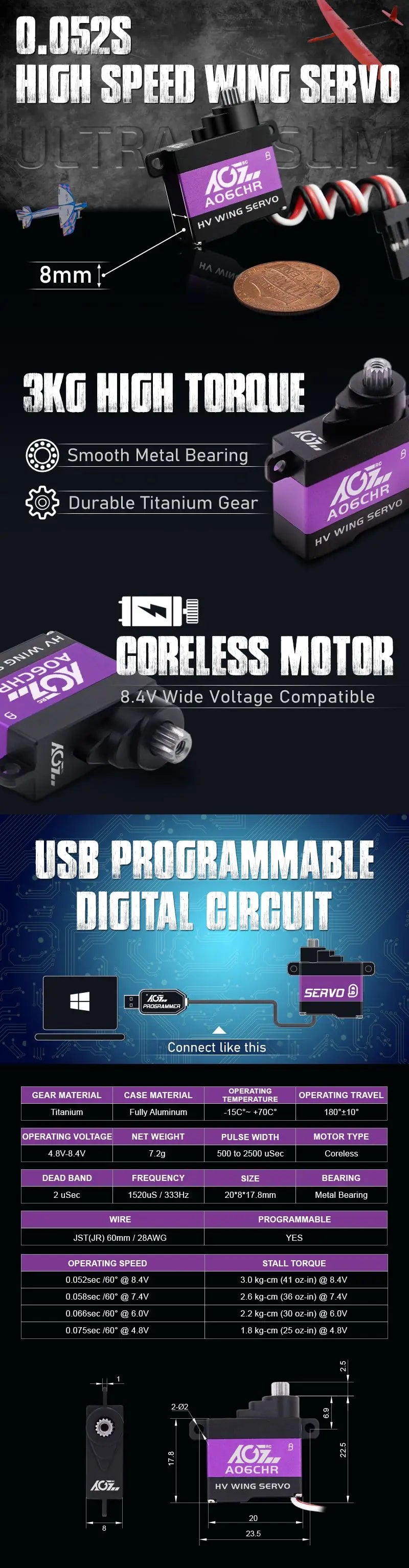 AGFrc A06CHR is a brand new 8mm thickness mini size wing servo, full CNC aluminium case to provide the good heat dissipation conditions, featuring a digital programmable circuit high voltage compatible. Enhance the coreless motor, so that we can ensure to output the 0.052sec lightning speed & 3.0kg-cm high torque at 8.4V. Two different mounting tabs option (A06CHR and A06CLS V2), suitable for wing or fuselage mounting. High accuracy and 7g light weight which is perfect for small size aircraft and glider wings with limit space requirements.