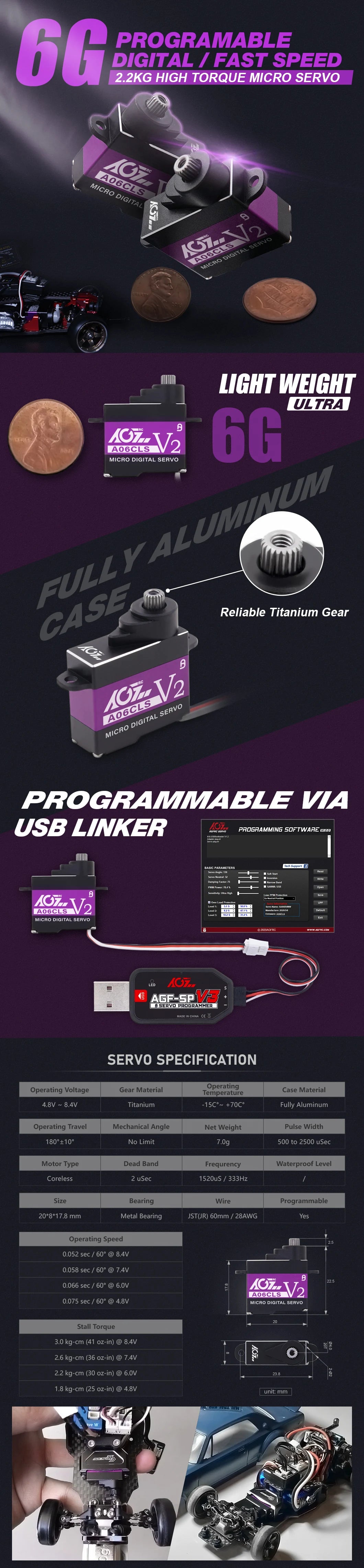 AGFRC A06CLS V2 Aluminum Case 20T HV 7g Titanium Gear 3.0KG 0.052Sec Super Fast Programmable Micro Servo for Mini Car GLR GLA MRZ Airplane