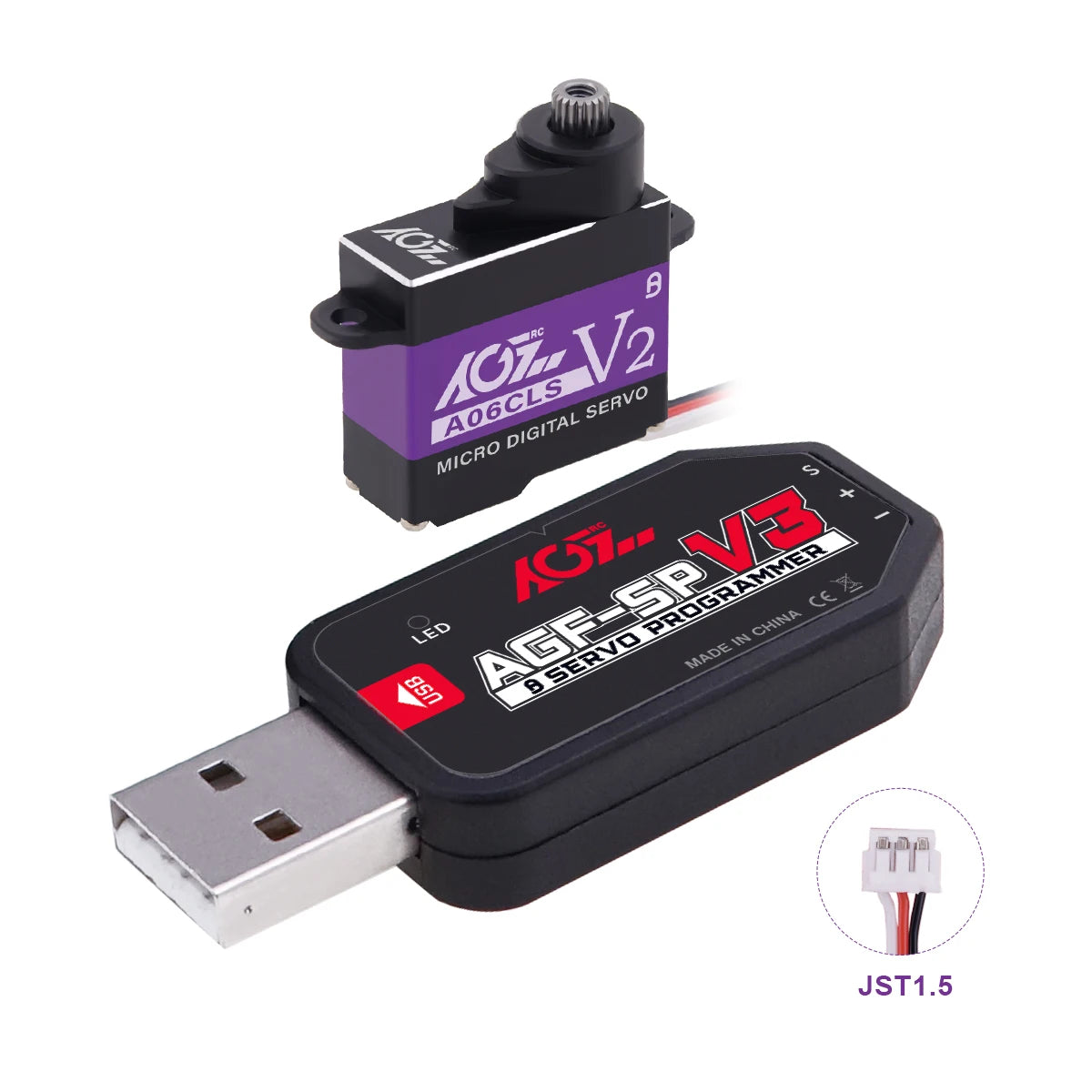 3.0kg, 0.052-second response time CNC micro servo with programmable via USB linker for basic parameter setting, including damping factor, T5 PWM port, and T84 option feedback; compatible with AGFRC A06CLS V2 models.